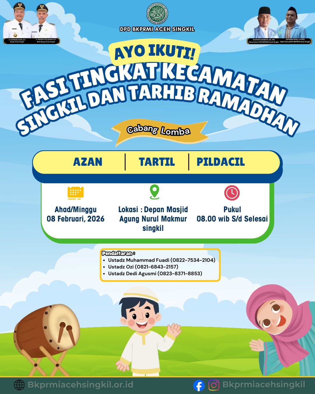 Singkil – DPD BKPRMI Aceh Singkil akan gelar perhelatan Festival Anak Saleh tingkat Kecamatan Singkil di Masjid Agung Nurul Makmur Aceh Singkil.