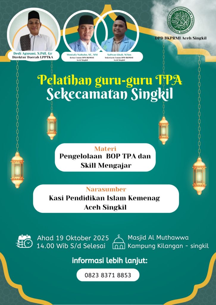 Singkil – DPD BKPRMI Aceh Singkil melalui Direktur Daerah LPPTKA kembali menggelar pelatihan bagi guru-guru TPA se Kecamatan Singkil tahun 2025.