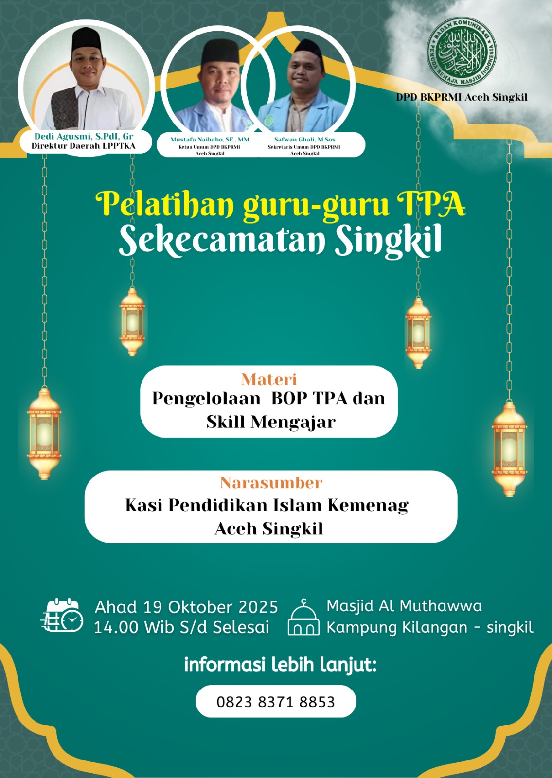 Kegiatan pertemuan kedua ini nanti akan di laksanakan pada Minggu, 19 Oktober 2025 di Masjid Al Muthawwa Kampung Kilangan Singkil.