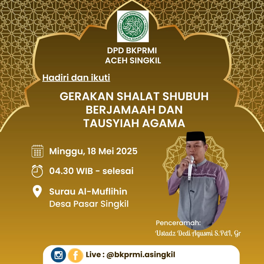 DPD Badan Komunikasi Pemuda Remaja Masjid Indonesia ( BKPRMI ) Kabupaten Aceh Singkil Bersama Dewan Masjid Indonesia Kabupaten Aceh Singkil akan melakukan kunjungan Safari Shubuh ke Surau Al Muflihin Kampung Pasar Kecamatan Singkil Kab. Aceh Singkil dalam rangka Gerakan Shubuh Berjamaah, untuk itu kami mohon kepada Kaum Muslimin mari kita hadiri gerakan Shubuh berjamaah sekaligus Tausiyah yang di laksanakan pada